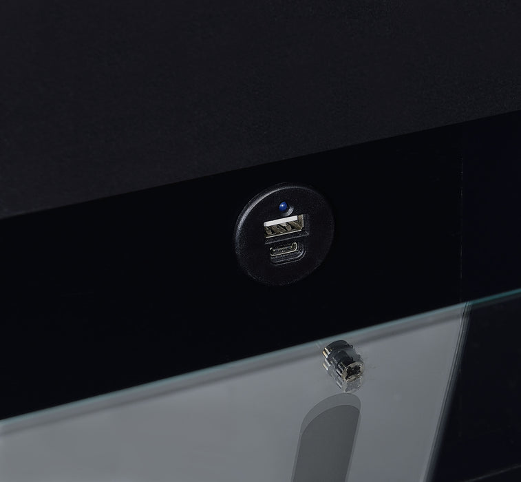 This high gloss makeup vanity set, crafted from engineered wood with eco-friendly laminate, blends seamlessly into your bedroom, doubling as a chic chest of drawers. The flip-top vanity mirror with LED lighting offers perfect illumination, while built-in dual USB outlets (Type A and Type C) allow for convenient device charging. The clear glass tabletop reveals a compartmentalized drawer for easy organization, and the cushioned vanity chair includes extra storage. Clear acrylic and chrome pull handles add a modern, elegant touch. Key Features: • White high gloss makeup vanity set crafted from engineered wood with eco-friendly laminate • Flip-top mirror with LED lighting for bright, even illumination • Built-in dual USB outlet with Type A and Type C ports for convenient device charging • Clear glass tabletop reveals a compartmentalized drawer for organized storage • Clear acrylic with chrome pull handles add a modern, elegant touch
